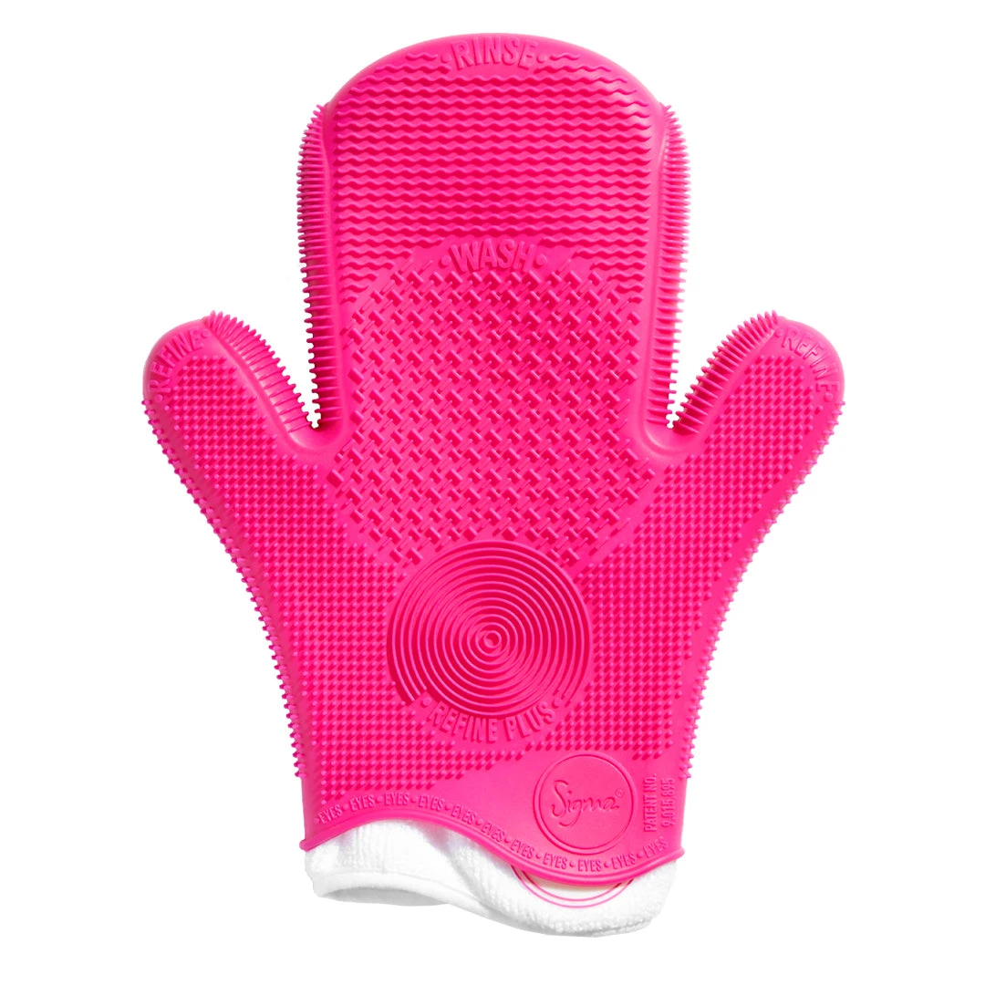 Place glove on hand (left or right). Wet brush under warm, running water. Apply 1-3 pumps of SigMagic Brushampoo Liquid or Foam directly onto brush fibers or WASH texture. Swirl brush on WASH texture, using Face textures for larger brushes and Eye textures for smaller brushes. Using warm water, sweep brush back and forth on RINSE texture to remove makeup and cleanser. Move brush up and down on REFINE texture to ensure all makeup is removed. Swirl brush on REFINE PLUS texture for an added clean. Add more brush cleanser and repeat steps 1-5 as needed. Using the texture on the thumb, gently squeeze brush bristles to remove excess water. You can use the microfiber insert of the glove to polish brush ferrules as well.